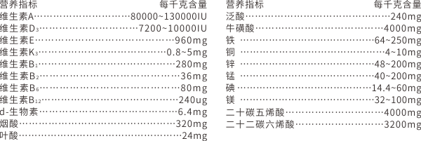 【原料組成】牛磺酸、深海魚油、復合維生素、復合微量元素、純化水等。